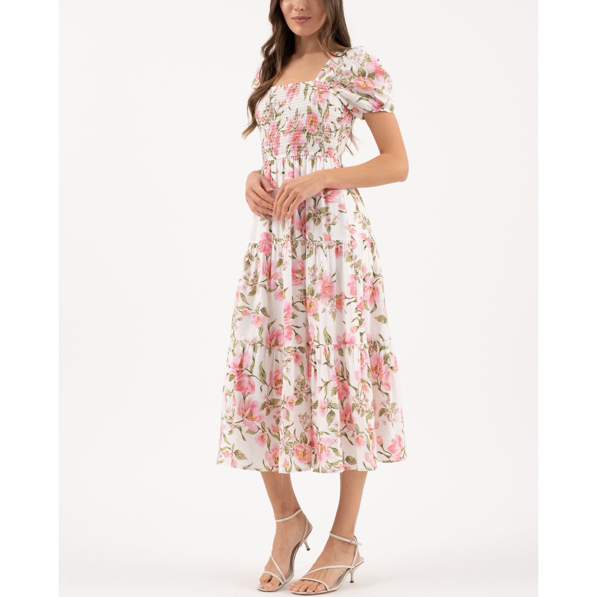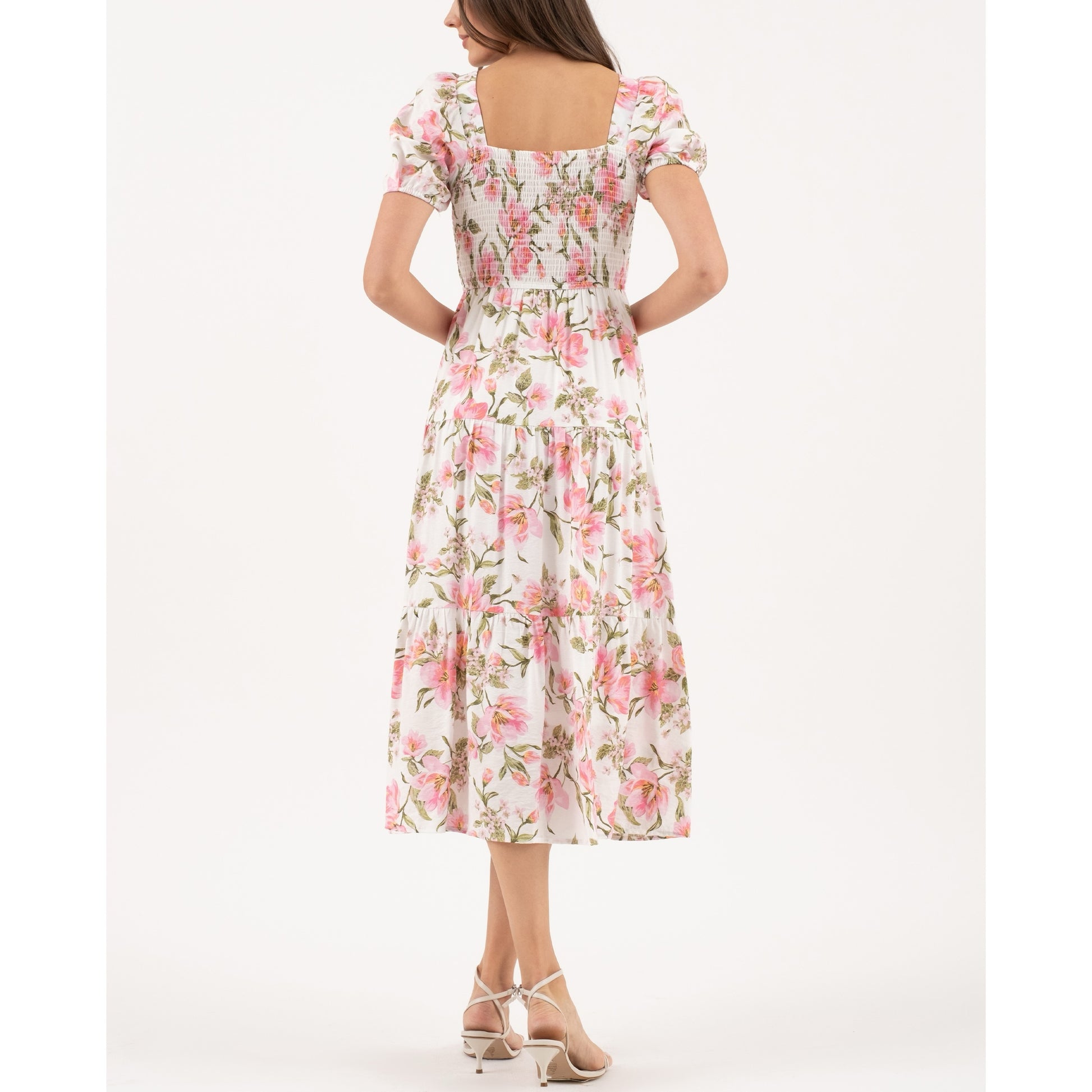 SQUARE NECKLINE SMOCKED SHORT SLEEVES PUFF SLEEVES RUFFLE HEM FLORAL PRINT ROSE PRINT MIDI DRESS LINED SHELL: 80% RAYON, 20% NYLON LINING: 100% POLYESTER